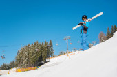 Narciarz w kombinezonie narciarskim i kasku na świeżym śniegu pudrowym ze śnieżnymi sosnami na tle. Człowiek freerider w goglach narciarskich trzymając kije narciarskie i wykonując skok podczas zjeżdżania po pokrytych śniegiem stokach