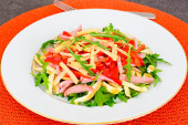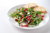 Sałatka surowego kopru włoskiego z grejpfrutem i czerwoną cebulą, podawana na ciemnej płycie i drewnianym stole rustykalnym, przestrzeń do kopiowania, wybrane ognisko, wąska głębokość pola