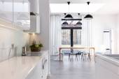 Elegancka biała kuchnia z marmurowym blatem na wyspie kuchnia i ściany w stylu przemysłowym z odsłoniętą czerwoną cegłą