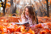 Stylowa kobieta czytająca książkę w jesiennym parku. Relaks, radość, samotność z naturą.