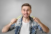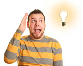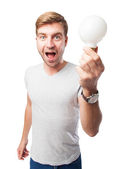 młody człowiek z lampy energooszczędne, biały na białym tle na