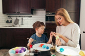Portret szczęśliwej młodej kobiety malującej jajka wielkanocne z uroczym synkiem