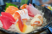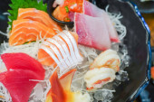 Mieszane sashimi, duży talerz sashimi, zestaw Sashimi, surowe ryby, japońskie jedzenie w azjatyckiej restauracji