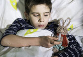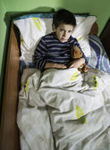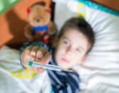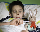 chore dziecko w łóżku z misiem