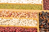 Różne fasolki w drewnianym pudełku. Borlotti, czarne oczy, adzuki, szkarłatny biegacz, żółw czarny.