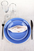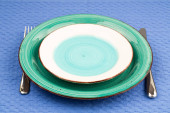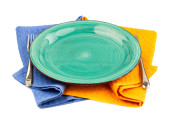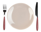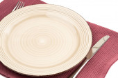 Beżowy talerz, nóż i widelec na fioletowym ręczniku bawełnianym na białym tle.