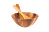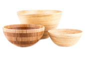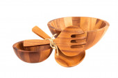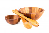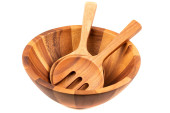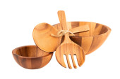 Drewniane miski, łyżka i uchwyt izolowane na białym tle.