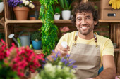 Ciemnowłosy brodaty mężczyzna gospodarstwa fioletowy kwiat w garnku przed kwiaciarnią