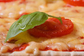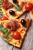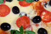 Pizza z salami, pomidor, ser, oliwki i bazylia. makro