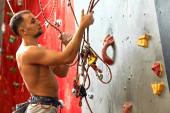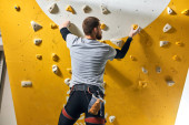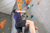 Profesjonalny alpinista z niepełnosprawnością fizyczną badający ścianę wspinaczkową
