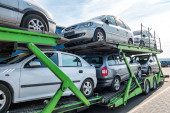 Ciężarówka holownicza naczepa transportowa na autostradzie przewożącej partię uszkodzonych samochodów sprzedawanych na aukcjach samochodów ubezpieczeniowych do naprawy i odzyskiwania. Usługi w zakresie przemieszczania i ratownictwa pojazdów