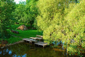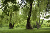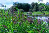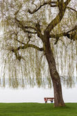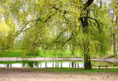 Młoda dziewczyna odpoczywa w parku miejskim. Siedząc pod drzewem nad rzeką
