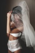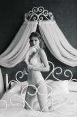 Dzień panny młodej. Seksowna dziewczyna w białej koronkowej bieliźnie. Portret pięknej młodej kobiety w białej bieliźnie. Uwodzicielska kobieta w białej bieliźnie i peignir.