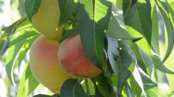 dojrzałe brzoskwinie na gałęzi z liśćmi oświetlonymi słońcem