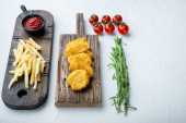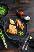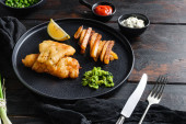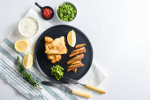 Zdjęcie "Ryba z frytkami. Tradycyjne brytyjskie gorące danie smażone ryby, chipsy ziemniaczane, mushy groszek miętowy i sos tatarski i ketchup widok z góry, czarny kamień tło miejsce na tekst." może być wykorzystywane do celów osobistych i komercyjnych zgodnie z warunkami zakupionej licencji Royalty-free. Obraz jest dostępny do pobrania w jakości wysokiej rozdzielczości do 5760x3840.