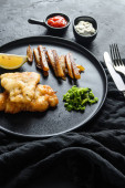 Ryba z frytkami. Tradycyjne brytyjskie gorące danie smażone ryby, chipsy ziemniaczane, mushy groszek miętowy i sos tatarski i ketchup widok z góry, czarny kamień tło miejsce na tekst.