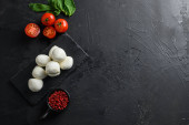 Zdjęcie "Świeże pomidory wiśniowe, liść bazylii, ser mozzarella na czarnej tablicy z kamienia łupkowego Zdrowe włoskie tradycyjne składniki sałatki caprese. Koncepcja żywności ekologicznej śródziemnomorskiej, przestrzeń na tekst w poziomie widok z góry." może być wykorzystywane do celów osobistych i komercyjnych zgodnie z warunkami zakupionej licencji Royalty-free. Obraz jest dostępny do pobrania w jakości wysokiej rozdzielczości do 5760x3840.
