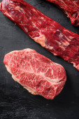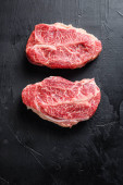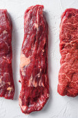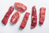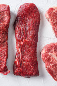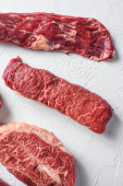 Surowe górne ostrze wyciąć organiczne mięso wyciąć widok z góry zbliżenie nad białym betonem tło pionowe selektywne ostrość.