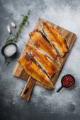 Scomber marynowany czosnkiem i szafranem na szarym tle.