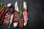 Longaniza, tradycyjna hiszpańska kiełbasa salami na czarnej fakturowanej powierzchni, topview z miejscem na tekst.