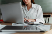 Azji młoda kobieta na białej sukience koncentruje się pracy na laptopie w nowoczesnym pokoju biurowym.