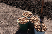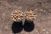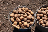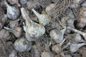 Proces suszenia cebuli. Widok z góry na suszone cebule na rynku.