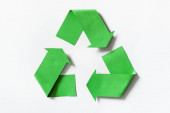 widok z góry na zielone symbole recyklingu z planetą izolowaną na beżu