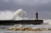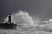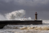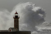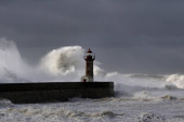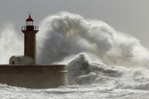 Wielkie białe fale nad molo i latarnią morską przeciwko ciemnemu, pochmurnemu niebu przed deszczem. Ujścia rzeki Douro, Porto, Portugalia, podczas burzy morskiej.