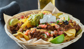 meksykański talerz enchilady z czerwonym sosem, orzeźwioną fasolą i ryżem