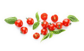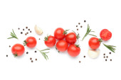 Składniki do gotowania, czosnek, pomidory, przyprawy i zioła izolowane na białym tle. Widok z góry.