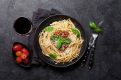 Włoski makaron z pomidorami, ser parmezan i bazylia na czarnym talerzu na ciemnym tle. Widok z góry.