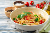 Włoski makaron z pomidorami, ser parmezan i bazylia na czarnym talerzu na drewnianym tle.