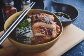Węgorz japoński grillowany z ryżem lub Unagi don ustawiony na miskę w japońskim stylu. Skupienie selektywne