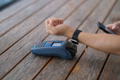 zamknąć ludzi posiadających kartę kredytową, aby zapłacić za terminal pos na liczniku. rozmyte tło