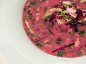 Kobieta kładzie rękę na stole Lokshina zupa z parą żeber (żeberka wieprzowe, figi, grzyby Shiitake, makaron ryżowy, ciemny sos sojowy)