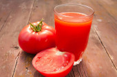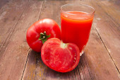 sok pomidorowy i dojrzałe różowe pomidory odizolowane zbliżenie na białym tle