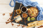 Zdjęcie "Zdrowe śniadanie na starym tle" może być wykorzystywane do celów osobistych i komercyjnych zgodnie z warunkami zakupionej licencji Royalty-free. Obraz jest dostępny do pobrania w jakości wysokiej rozdzielczości do 5760x3840.