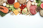 Produkty bogate w białko na szarym stole, płaskie układanki. Miejsce na tekst
