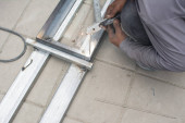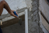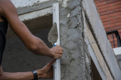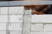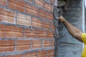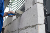murarz budowlany murarz wykonujący cegielnię z kielnią i zaprawą cementową