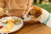 Pies siedzi na krześle przy stole na świeżym powietrzu z właścicielem. Szkolenie psów