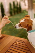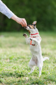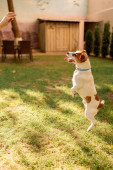 Młoda kobieta bawi się ze swoim psem. Mieszane psy skaczące na ulicy, na zewnątrz. Szczęśliwy szczeniak na łące.