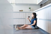 Uśmiechnięta młoda kobieta z winem za pomocą smartfona siedząc na blacie kuchennym