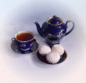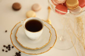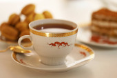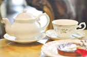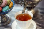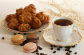 eklerka w polewie czekoladowej i filiżanka herbaty na stole