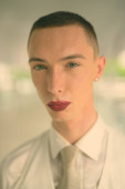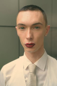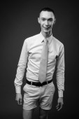Studio strzał młody przystojny androgynous biznesmen na szarym tle w czerni i bieli