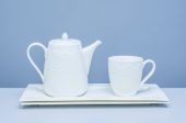 Białe porcelanowe kubki i figurka ptaka robaczka na tacy na drewnianym szarym stole.