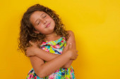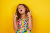 Niezadowolona brunetka piękna dziewczynka w letniej sukience na żółtym tle zatyka nos jak pachnie coś cuchnie i nieprzyjemne, czuje awersję. Młoda atrakcyjna kobieta nienawidzi obrzydliwego zapachu, który pochodzi z pokoju obok