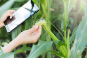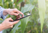 Portret kobiety agronomistki trzymającej tabletkę i badającej liście soi rosnące na polu.