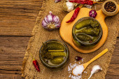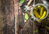 Marynowane ogórki marynowane z przyprawami i ziołami. Tradycyjna domowej roboty fermentowana przystawka w glinianej misce. Stary drewniany stół, widok z góry