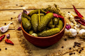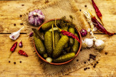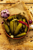 Marynowane ogórki marynowane z przyprawami i ziołami. Tradycyjna domowej roboty fermentowana przystawka w glinianej misce. Stary drewniany stół, widok z góry