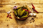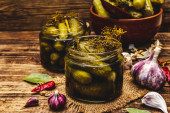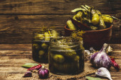 Zdjęcie "Marynowane ogórki marynowane z przyprawami i ziołami. Tradycyjna domowej roboty fermentowana przystawka w glinianej misce. Stary drewniany stół, widok z góry" może być wykorzystywane do celów osobistych i komercyjnych zgodnie z warunkami zakupionej licencji Royalty-free. Obraz jest dostępny do pobrania w jakości wysokiej rozdzielczości do 5760x3840.